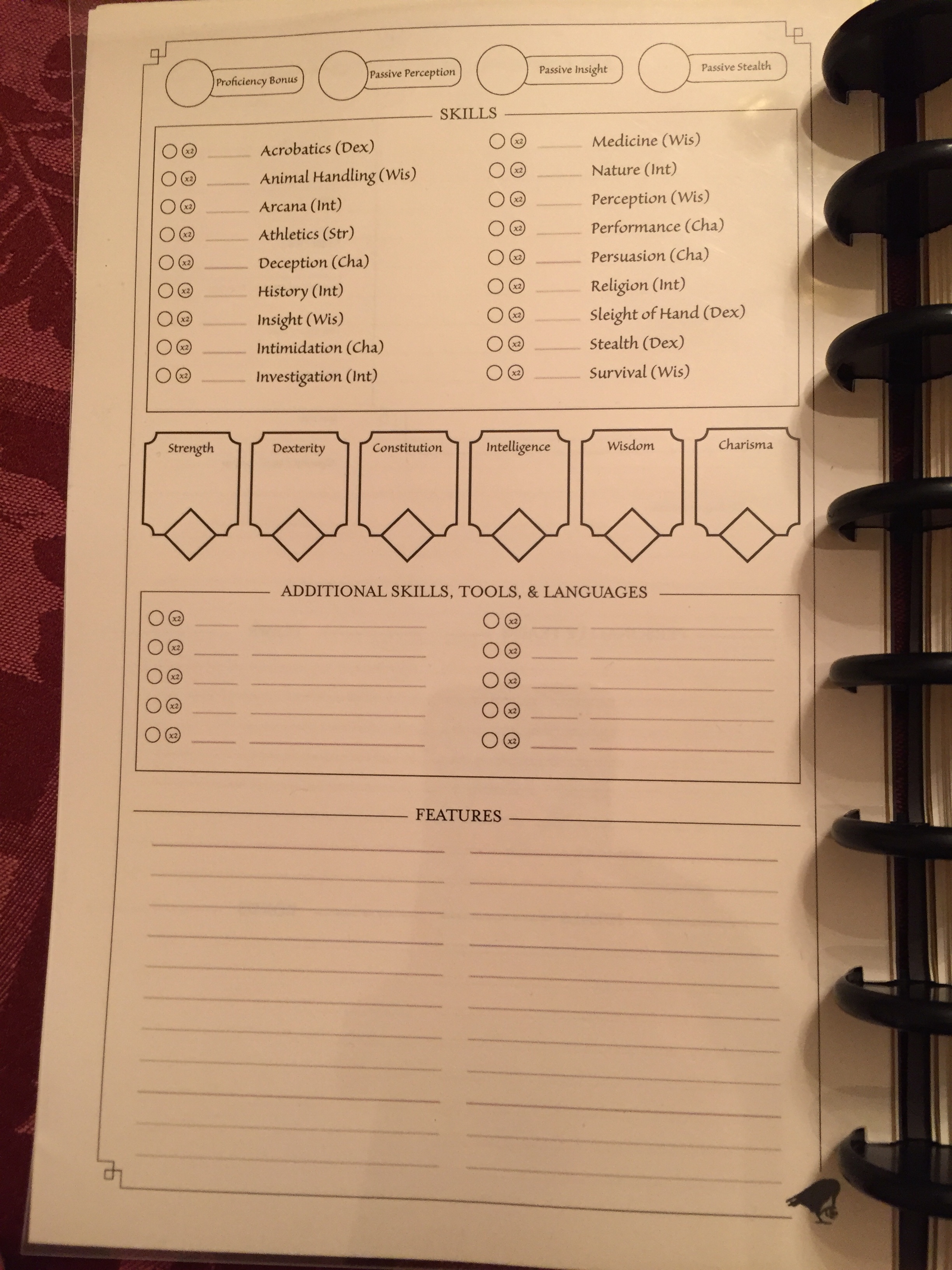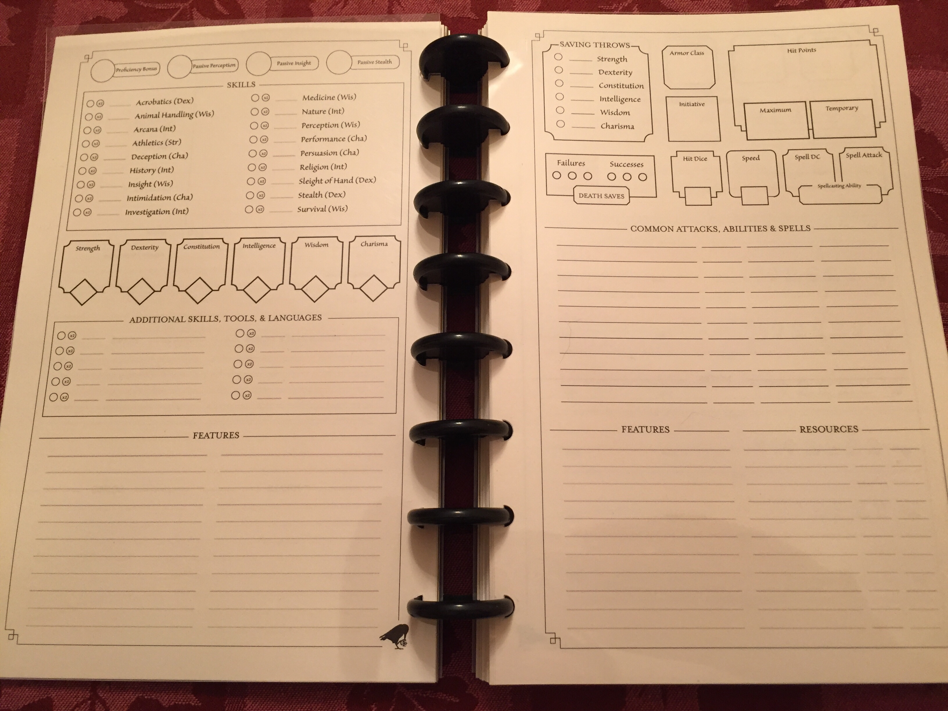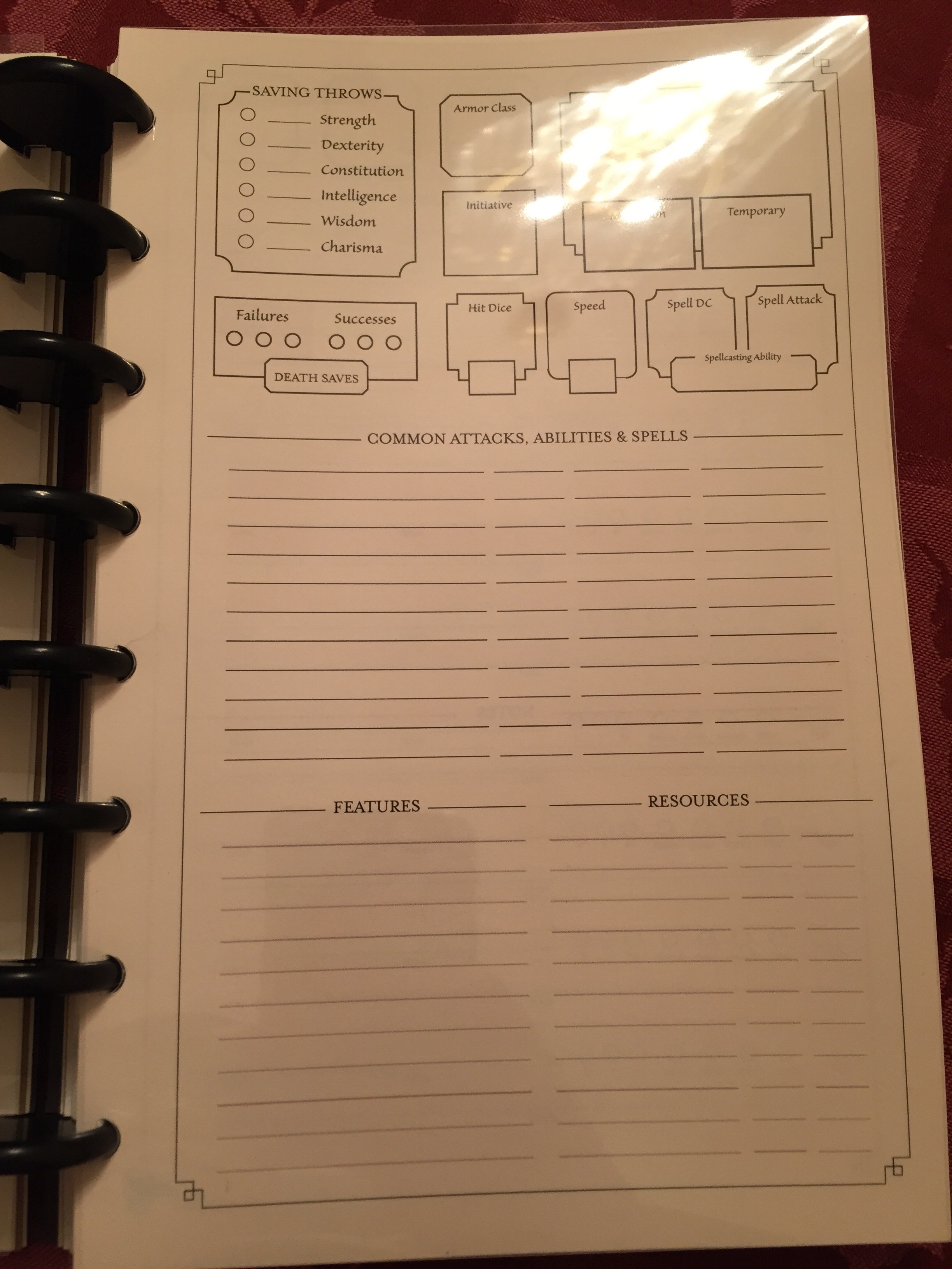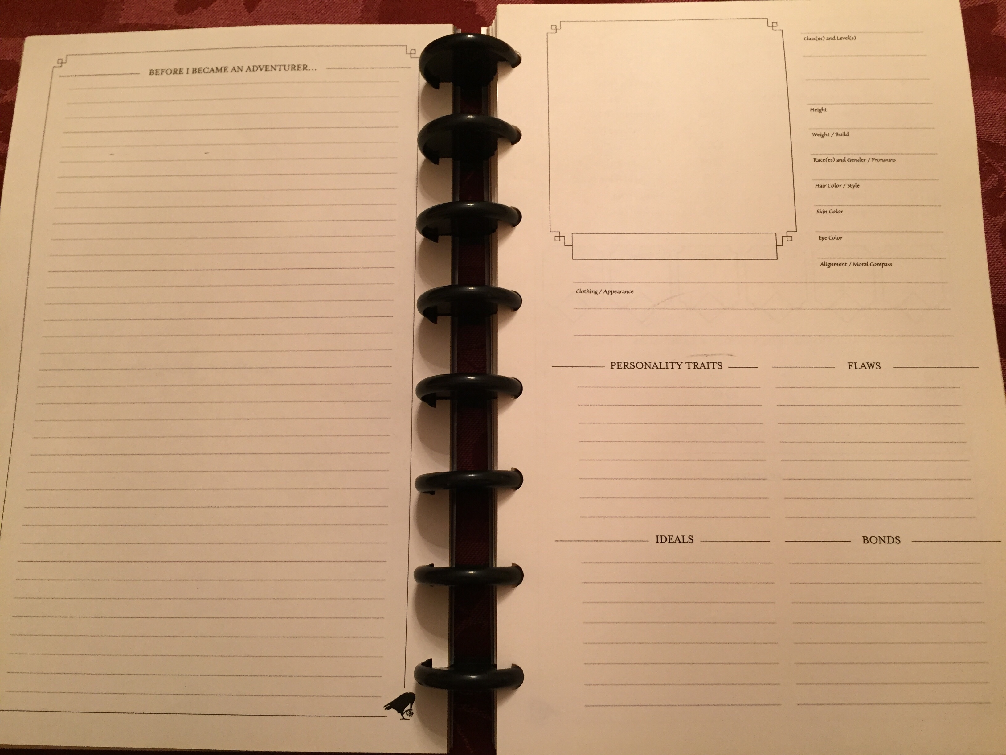 When playing tabletop roleplaying games, especially with the likes of Dungeons & Dragons, players always run into the problem of organizing their character sheets, notes, and whatever reference material they have at their disposal. Often, the table is cluttered with sheets of paper or notepads, which prevents the player from finding the relevant information promptly. D&D Beyond is a digital resource that seeks to mitigate this issue, and various other attempts to keep the character sheet limited to only one piece of paper has been attempted many times. Most campaign journals or diaries for the most part just contain room to fit lore and non-essential materials, excluding space for character sheets or anything relating to the actual roleplaying system. Granted these journals are intentionally designed to be system agonistic and therefore should be considered a flaw or fault.