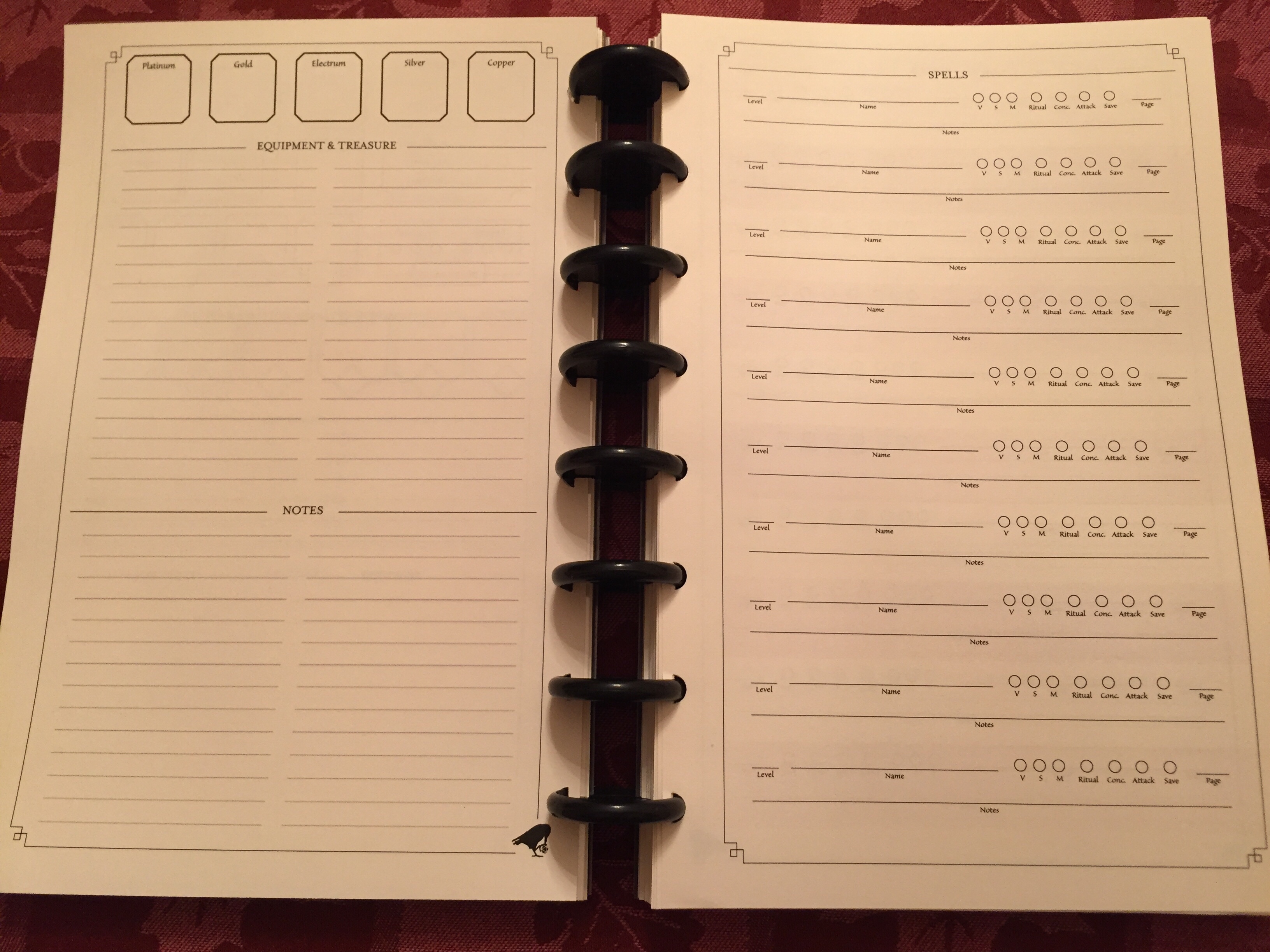 As a whole, the Mischief & Misadventure Campaign Diary is a great product to have as a character sheet alternative. The overall design is aesthetically pleasing, and ring-binding is very unique. The pages could be made thicker, but I feel the cover could definitely be made of a cardboard-like material to help reinforce it and protect the diary better. The Body Armor cover is excellent for preventing smudges, and I ordered the spell-card sleeves to try out as well. There is plenty of care and the folks at the Rook & the Raven genuinely wish to create a quality product, whch is definitely reassuring. My one general advice when using one of these diaries is to not fully assemble it beyond your character sheet, spell slots, and a few page packets for sketches or even the graph-lined paper. The session note pages are better kept out of the diary and written separately from the journal before placing them into the ring-binding.