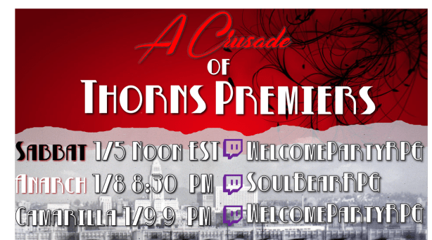 A Crusade of Thorns is a Vampire: the Masquerade 5th Edition (V5) chronicle set in Los Angeles in 1943. The game takes place several months before the infamous Zoot Suit Riots, along with the bustling rise of Hollywood (Tinseltown), and the surge of industry as the military wages war on the Pacific Front during World War 2. Racial tensions are high, the populace is fearful of an attack by the Japanese, and there is undeclared war hidden under the veil of the night between the lost established Camarilla and the Anarch Movement. The game will consist of three separate stories centered on the main factions within the world of Vampire: the Masquerade, notably the Camarilla, the Anarchs, and the Sabbat. All of which are under the umbrella of a large metaplot.