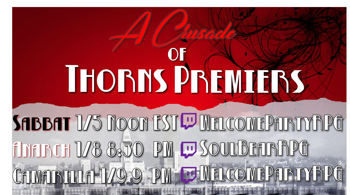 A Crusade of Thorns is a Vampire: the Masquerade 5th Edition (V5) chronicle set in Los Angeles in 1943. The game takes place several months before the infamous Zoot Suit Riots, along with the bustling rise of Hollywood (Tinseltown), and the surge of industry as the military wages war on the Pacific Front during World War 2. Racial tensions are high, the populace is fearful of an attack by the Japanese, and there is undeclared war hidden under the veil of the night between the lost established Camarilla and the Anarch Movement. The game will consist of three separate stories centered on the main factions within the world of Vampire: the Masquerade, notably the Camarilla, the Anarchs, and the Sabbat. All of which are under the umbrella of a large metaplot.