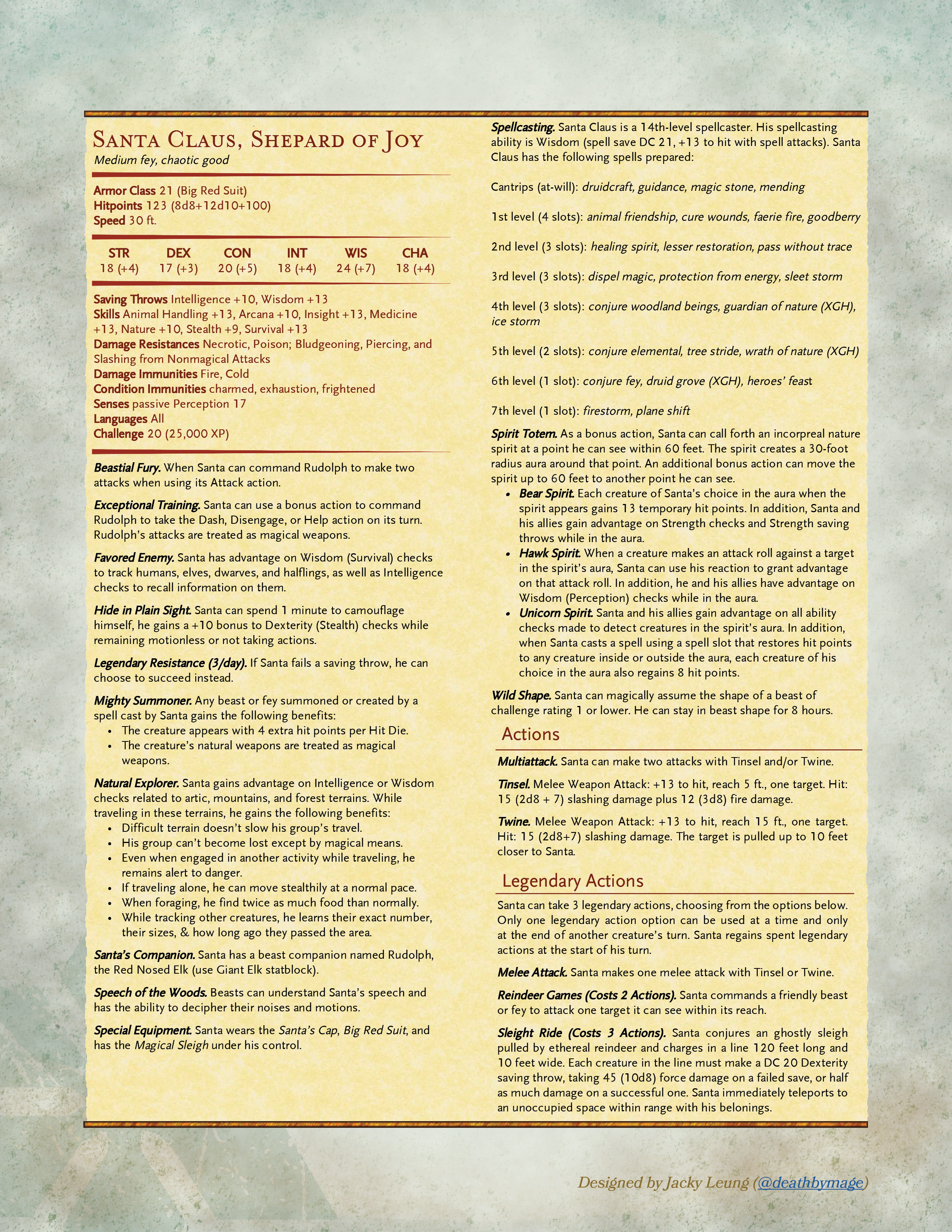 Also, this marks the 5th year I’ve been making Santa Claus stats featuring the D&D base classes! Time has sure flown, and while much has changed for me creatively, my love for Christmas has never waivered.